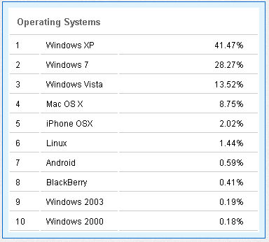 http://www.w3counter.com/globalstats.php ofrece una interesante estadística de de qué sistemas operativos se han usado mes a mes para navegar páginas web, y como es un uso muy frecuente en casi cualquier dispositivo, nos permite tener una idea general de la escala de uso de los distintos sistemas operativos actuales. La siguiente tabla corresponde a Febrero de 2011